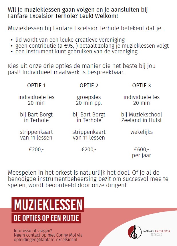 We bieden de mogelijkheid om individueel of groepsles te volgen bij onze dirigent Bart Borgt, of je kan muzieklessen volgen bij Muziekschool Zeeland. Je begint direct met het bespelen van een instrument en je leert de theorie gaandeweg. Na twee jaar kan je gaan meespelen bij de fanfare.